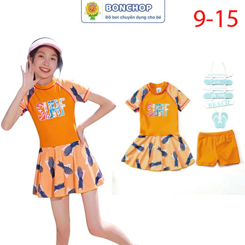 A506346 - Đồ bơi bé gái big size HAPPY SUMMER 2026 tay ngắn có váy liền che bụng_Size 9-15