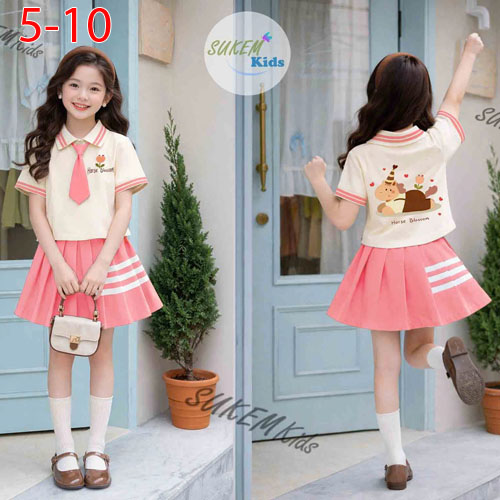 A506377 - (22/4)Set váy áo thun ngắn tay cổ trụ thắt caravat ép hình con ngựa chân váy may xếp ly in