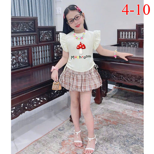 A507736 - Set bé gái thun cotton 4c mềm mịn in cây nấm chân váy bí caro_Size 4-10