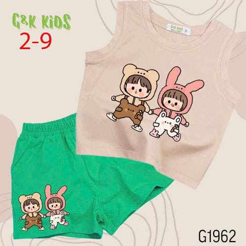A508035 - Bộ quần đùi áo sát nách bé gái chất thun coton 4c in 2 đứa bé_Size 2-9