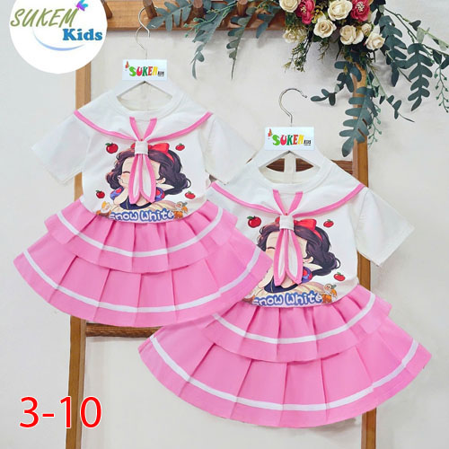 A508258 - Set váy áo thun ngắn tay cổ trụ caravat in bạch tuyết chân váy may 2 tầng xếp chạy sọc thể