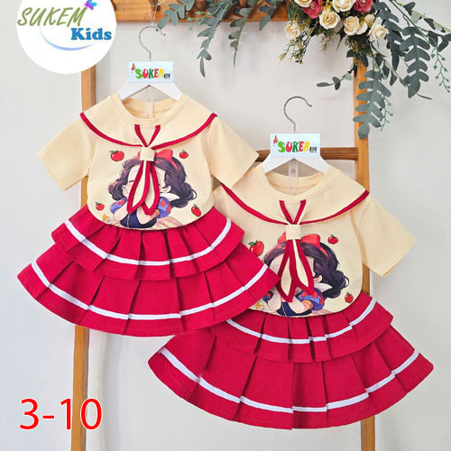 A508259 - Set váy áo thun ngắn tay cổ trụ caravat in bạch tuyết chân váy may 2 tầng xếp chạy sọc thể