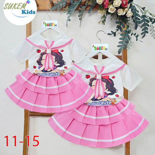 A508261 - Set váy áo thun ngắn tay cổ trụ caravat in bạch tuyết chân váy may 2 tầng xếp chạy sọc thể