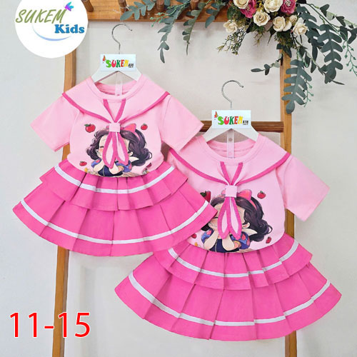 A508262 - Set váy áo thun ngắn tay cổ trụ caravat in bạch tuyết chân váy may 2 tầng xếp chạy sọc thể