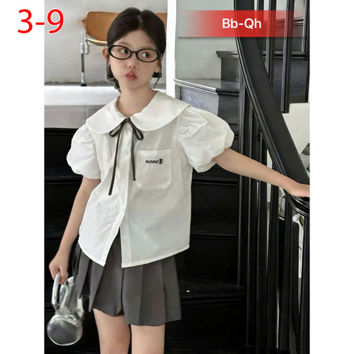 A508457 - (1/5)Set bé gái chuẩn vibe tiểu thư Hàn Quốc áo vải kate nhập chân váy kaki dập ly kèm chi