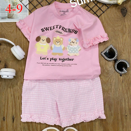 A508554 - (28/4)Bộ kiểu phong cách xinh xắn cho bé gái áo tay đắp bèo thun cotton 4c quần chất caro