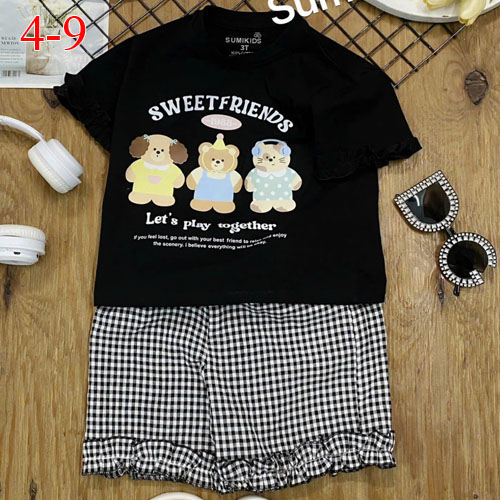 A508555 - (28/4)Bộ kiểu phong cách xinh xắn cho bé gái áo tay đắp bèo thun cotton 4c quần chất caro