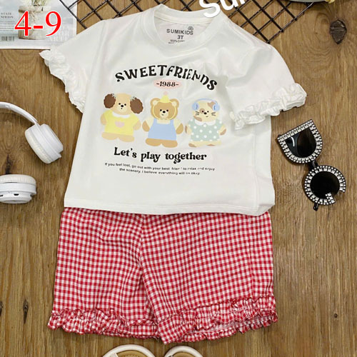 A508556 - (28/4)Bộ kiểu phong cách xinh xắn cho bé gái áo tay đắp bèo thun cotton 4c quần chất caro