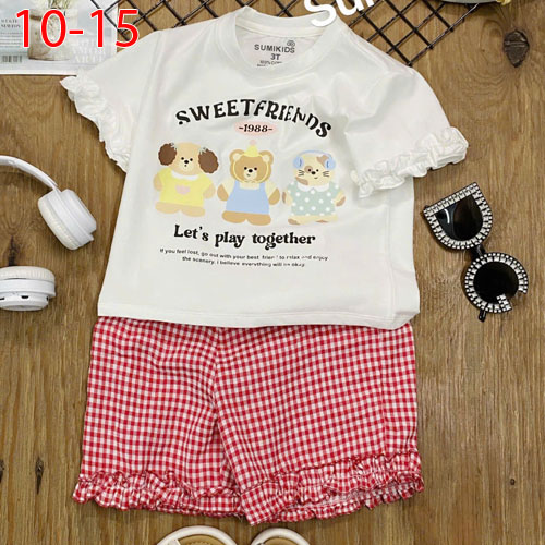A508561 - (28/4)Bộ kiểu phong cách xinh xắn cho bé gái áo tay đắp bèo thun cotton 4c quần chất caro