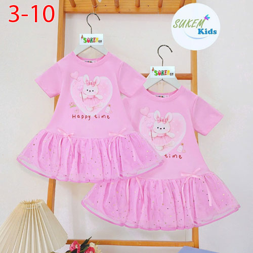 A508597 - Đầm may ngắn tay xinh ép thỏ xinh thân trên vải thun coton 4 chiều đuôi cá đính 2 nơ ruy b