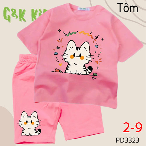 A508626 - Bộ áo phom rộng quần ngố bé gái chất thun coton 4c in mèo_Size 2-9