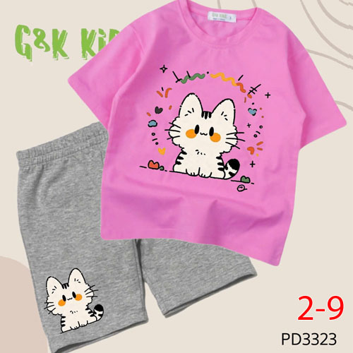 A508629 - Bộ áo phom rộng quần ngố bé gái chất thun coton 4c in mèo_Size 2-9