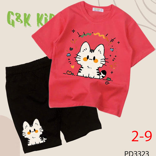 A508633 - Bộ áo phom rộng quần ngố bé gái chất thun coton 4c in mèo_Size 2-9