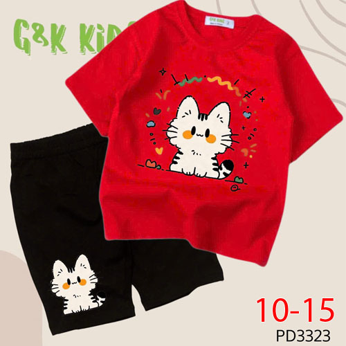A508653 - Bộ áo phom rộng quần ngố bé gái chất thun coton 4c in mèo_Size 10-15