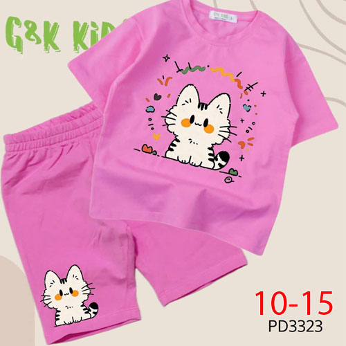 A508655 - Bộ áo phom rộng quần ngố bé gái chất thun coton 4c in mèo_Size 10-15