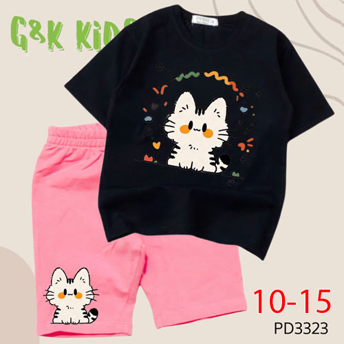 A508666 - Bộ áo phom rộng quần ngố bé gái chất thun coton 4c in mèo_Size 10-15