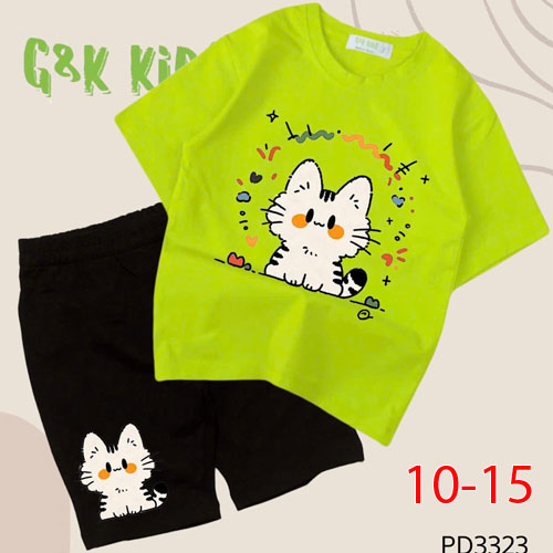 A508670 - Bộ áo phom rộng quần ngố bé gái chất thun coton 4c in mèo_Size 10-15