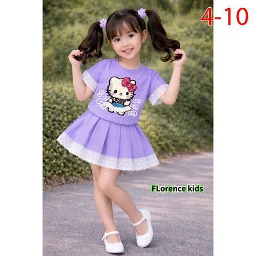 A508675 - Set váy cực xinh cho bé thun coton 4 chiều in Kitty cô bé chân váy xếp ly phối ren kèm chi