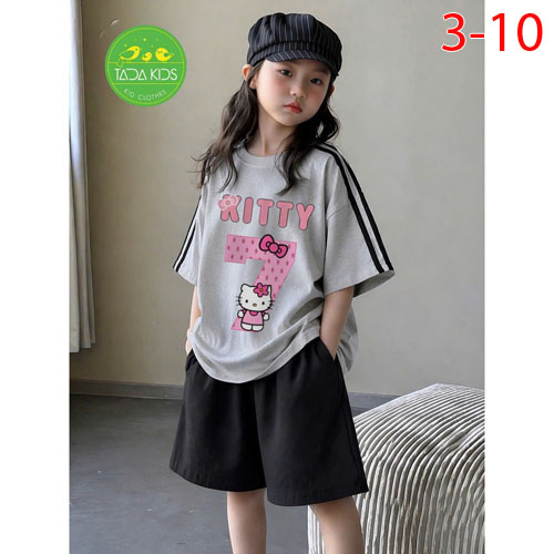A509011 - Bộ cotton bé gái siêu kute áo phom vừa mix quần dáng suông lửng sành điệu in Kitty mặt cườ