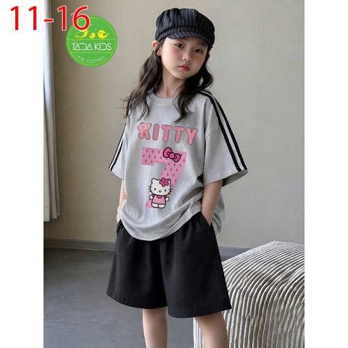 A509012 - Bộ cotton bé gái siêu kute áo phom vừa mix quần dáng suông lửng sành điệu in Kitty mặt cườ