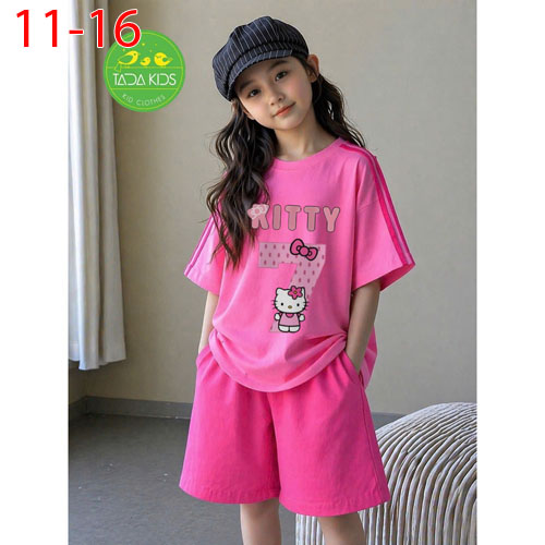 A509013 - Bộ cotton bé gái siêu kute áo phom vừa mix quần dáng suông lửng sành điệu in Kitty mặt cườ