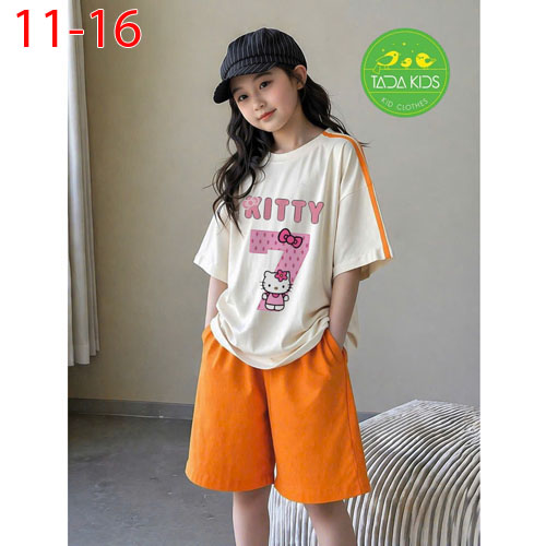 A509015 - Bộ cotton bé gái siêu kute áo phom vừa mix quần dáng suông lửng sành điệu in Kitty mặt cườ