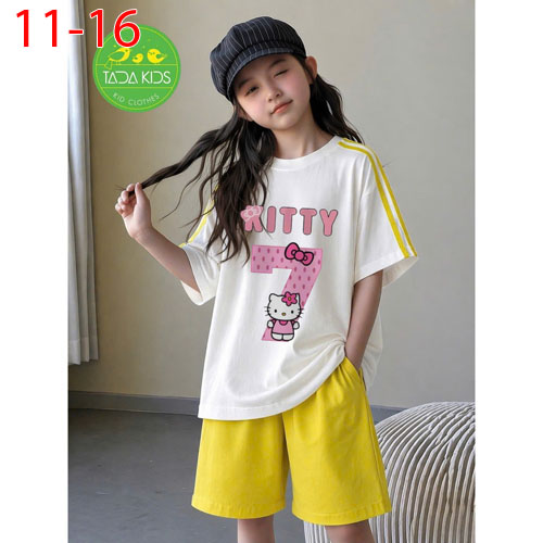 A509017 - Bộ cotton bé gái siêu kute áo phom vừa mix quần dáng suông lửng sành điệu in Kitty mặt cườ