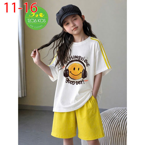 A509019 - Bộ cotton bé gái siêu kute áo phom vừa mix quần dáng suông lửng sành điệu in Kitty mặt cườ