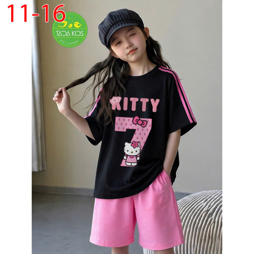 A509021 - Bộ cotton bé gái siêu kute áo phom vừa mix quần dáng suông lửng sành điệu in Kitty mặt cườ