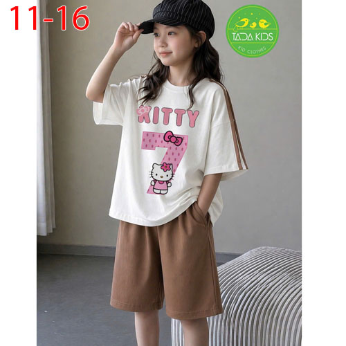 A509027 - Bộ cotton bé gái siêu kute áo phom vừa mix quần dáng suông lửng sành điệu in Kitty mặt cườ
