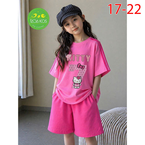A509029 - Bộ cotton bé gái siêu kute áo phom vừa mix quần dáng suông lửng sành điệu in Kitty mặt cườ