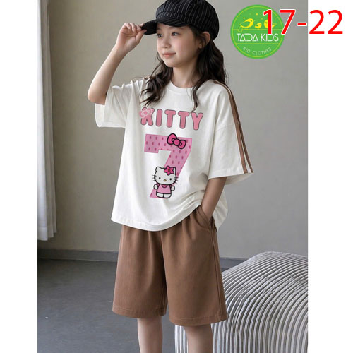 A509043 - Bộ cotton bé gái siêu kute áo phom vừa mix quần dáng suông lửng sành điệu in Kitty mặt cườ
