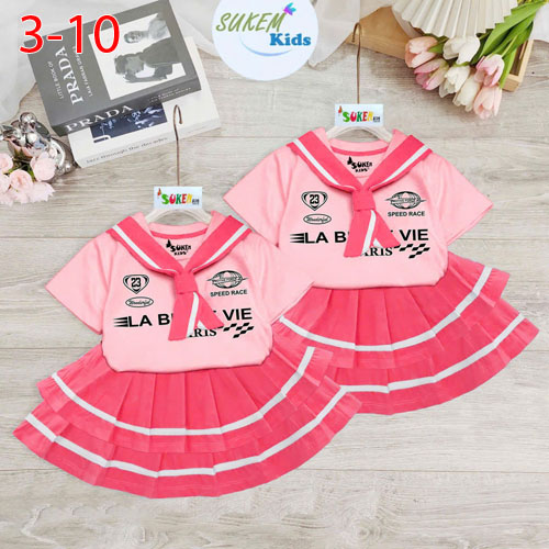 A511851 - (5/5)Set váy áo thun ngắn tay cổ trụ caravat chân váy may xếp chạy sọc thể thao_Size 3-10