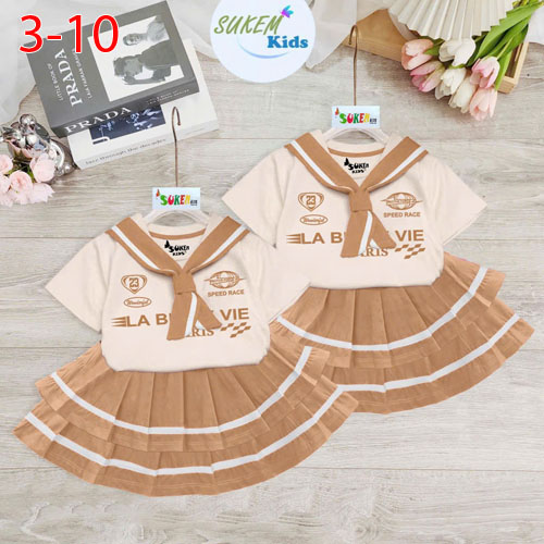 A511852 - (5/5)Set váy áo thun ngắn tay cổ trụ caravat chân váy may xếp chạy sọc thể thao_Size 3-10