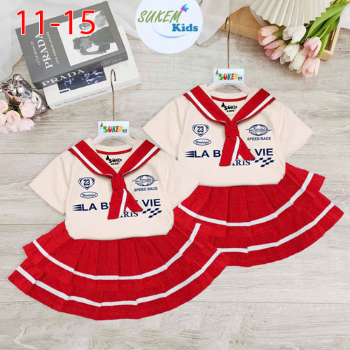 A511859 - (5/5)Set váy áo thun ngắn tay cổ trụ caravat chân váy may xếp chạy sọc thể thao_Size 11-15