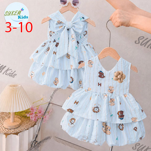 A511861 - Set bí ngô áo may cổ yếm đính hoa và thắt nơ sau lưng vải đũi nhăn in họa tiết_Size 3-10