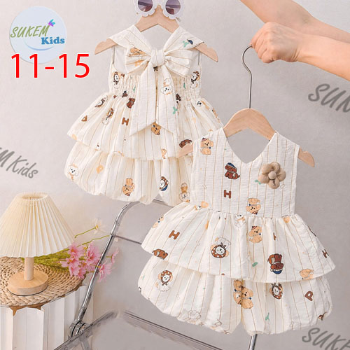 A511865 - Set bí ngô áo may cổ yếm đính hoa và thắt nơ sau lưng vải đũi nhăn in họa tiết_Size 11-15