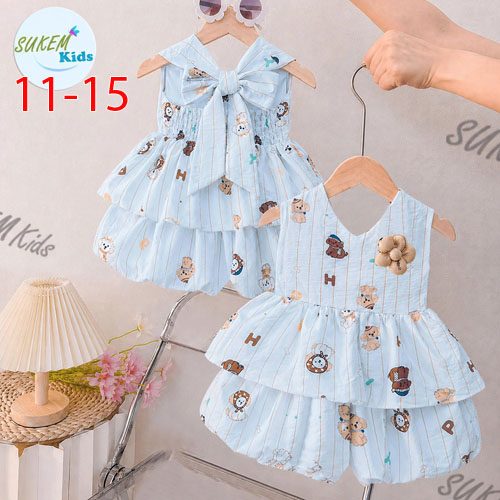 A511866 - Set bí ngô áo may cổ yếm đính hoa và thắt nơ sau lưng vải đũi nhăn in họa tiết_Size 11-15