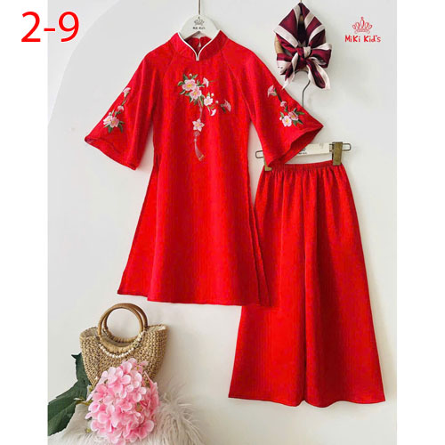 A466713 - Set áo dài bé gái 2 tà tơ nhung thêu hoa cổ tàu truyền thống viền bọc cổ tỉ mỉ ,2 tà áo th