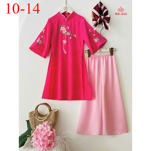 A466718 - Set áo dài bé gái 2 tà tơ nhung thêu hoa cổ tàu truyền thống viền bọc cổ tỉ mỉ ,2 tà áo th