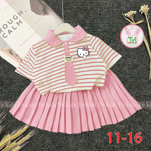 A467665 - Set áo trụ cà vạt váy xếp ly kèm chip đùi áo thun cotton in Kitty váy lụa nhập_Size 11-16