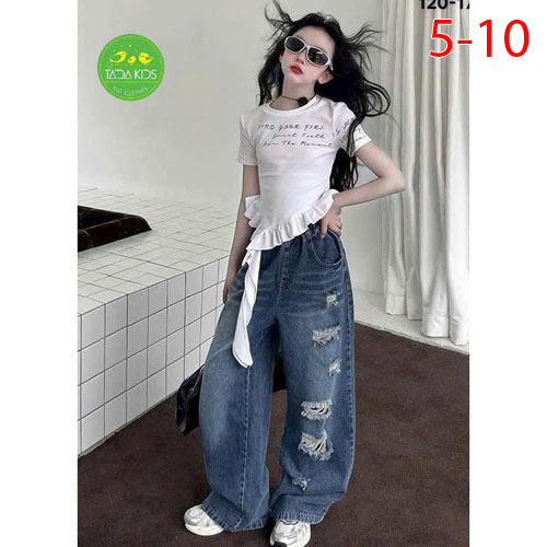 A467670 - (10/11)Set jean bé gái áo thun contton cách tân mix cùng quần jean suông wash rách cá tính