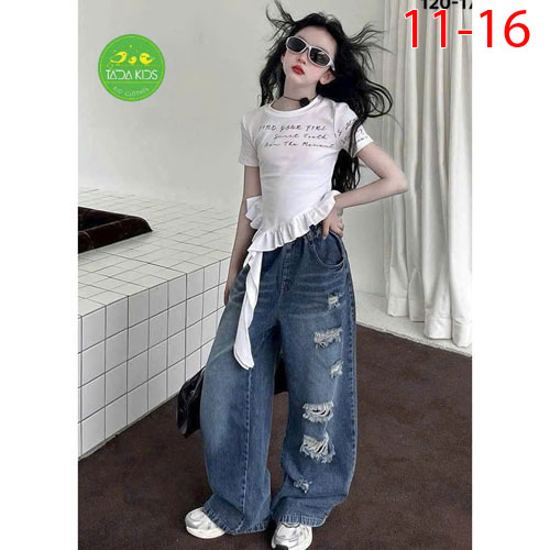 A467671 - (10/11)Set jean bé gái áo thun contton cách tân mix cùng quần jean suông wash rách cá tính