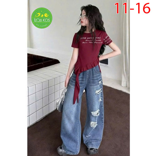 A467672 - (10/11)Set jean bé gái áo thun contton cách tân mix cùng quần jean suông wash rách cá tính