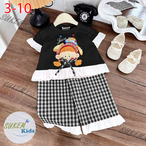 A462441 - Set bé gái áo may ngắn tay nhún bèo xinh ép hình cute đính nơ karo quần dài suông karo nhú