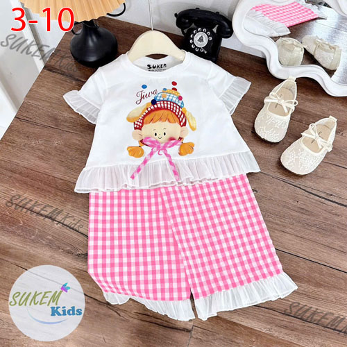 A462447 - Set bé gái áo may ngắn tay nhún bèo xinh ép hình cute đính nơ karo quần dài suông karo nhú