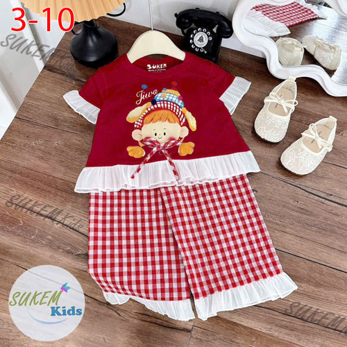 A462449 - Set bé gái áo may ngắn tay nhún bèo xinh ép hình cute đính nơ karo quần dài suông karo nhú