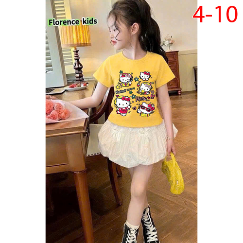 A509309 - Set váy dập ly ren cực xinh cho bé áo thun cotton 4c in Kitty chân váy bí kèm chip trong_S
