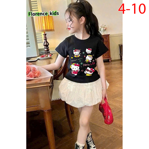 A509310 - Set váy dập ly ren cực xinh cho bé áo thun cotton 4c in Kitty chân váy bí kèm chip trong_S