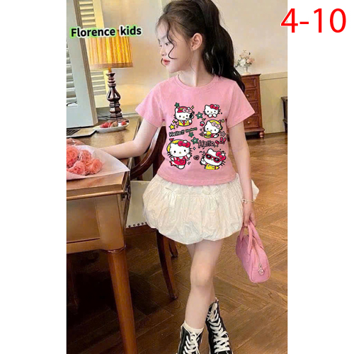 A509314 - Set váy dập ly ren cực xinh cho bé áo thun cotton 4c in Kitty chân váy bí kèm chip trong_S